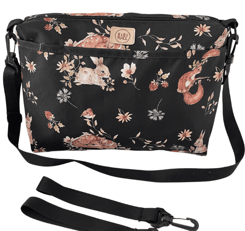 Organizer ma regulowany pasek na ramię oraz uchwyty do przypięcia do wózka, co pozwala na wygodne użytkowanie w każdej sytuacji – od szybkiego spaceru po dłuższe wyjścia.