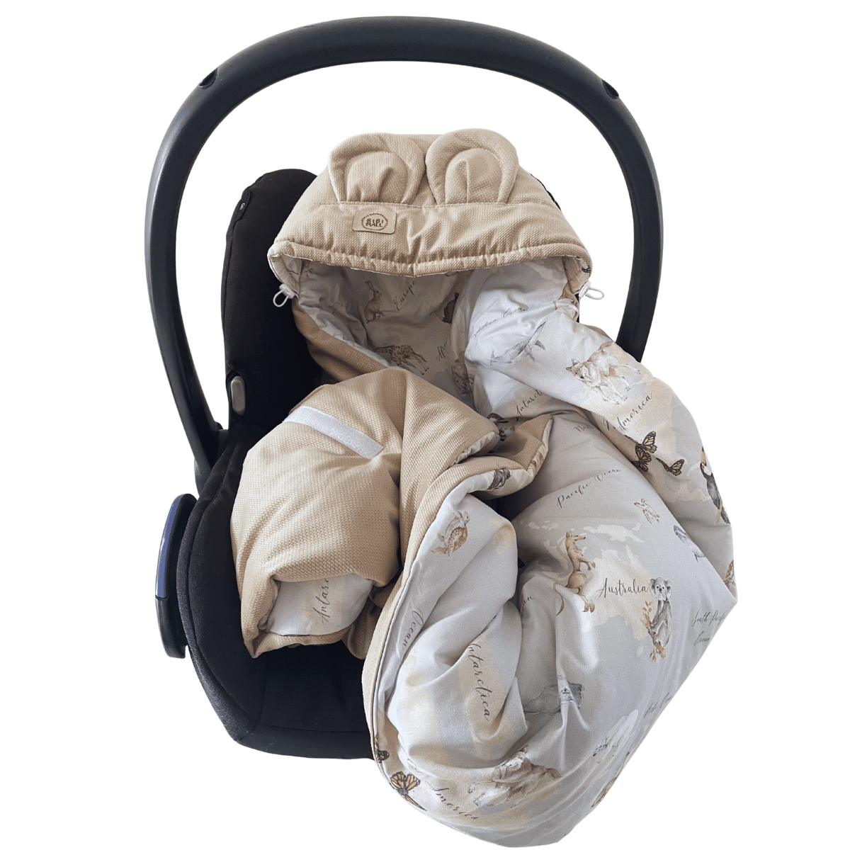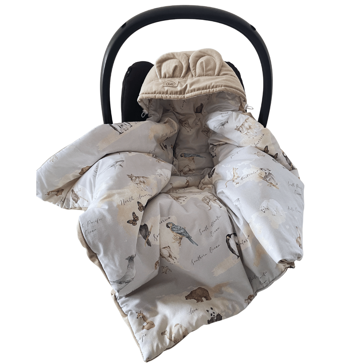 Otulacz do fotelika to must-have każdej mamy,która chce zapewnić swojemu maluszkowi ciepło i bezpieczeństwo w podróży.Uszyty z połączenia bawełny premium oraz miękkiego velvetu,otula dziecko delikatnością już od pierwszych dni życia.