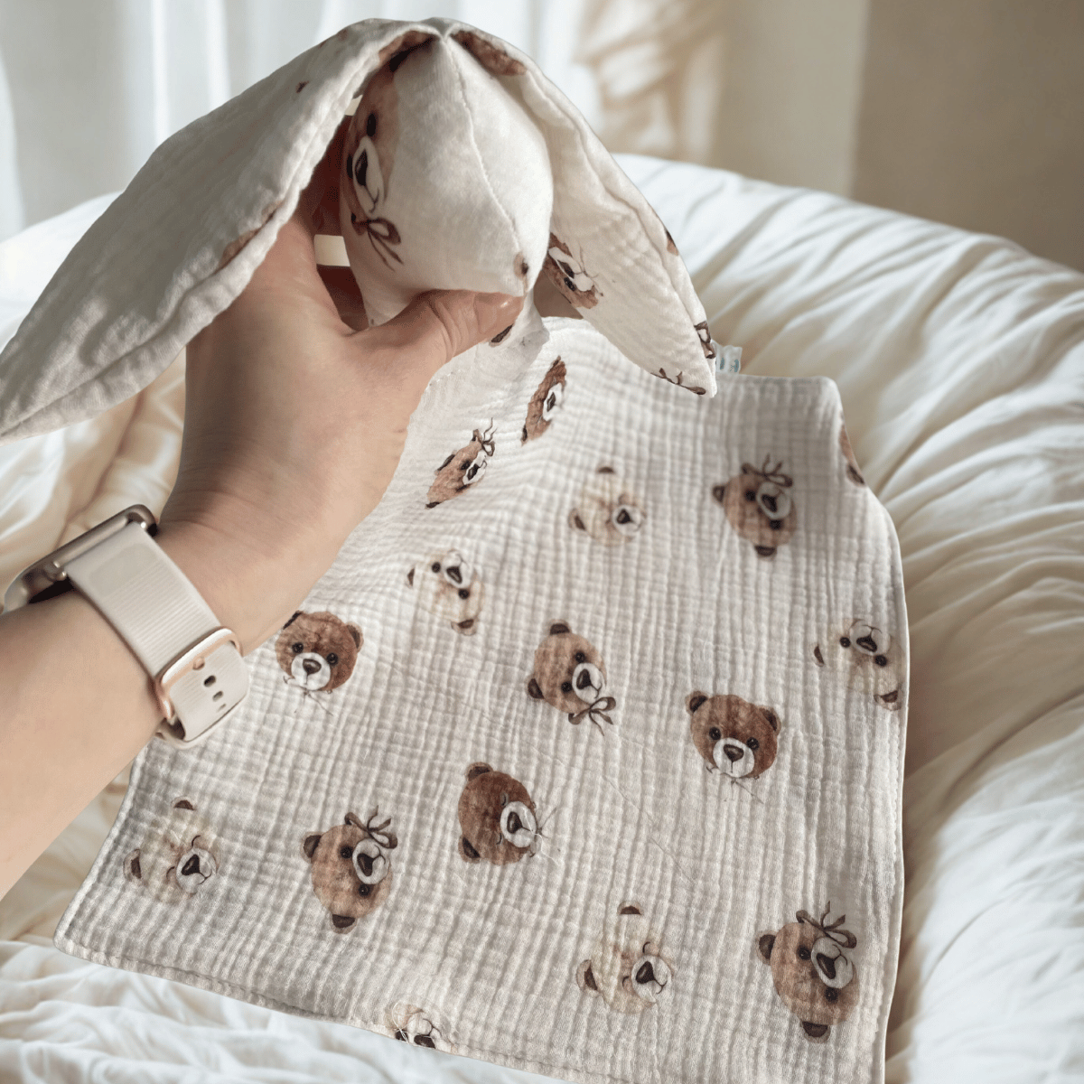 Delikatna pieluszka muślinowa w misie w formie przytulanki króliczka to idealny wybór dla noworodka już od pierwszych dni życia.Miękka,lekka i bezpieczna–pomaga dziecku wyciszyć się przed snem i daje poczucie bliskości.
