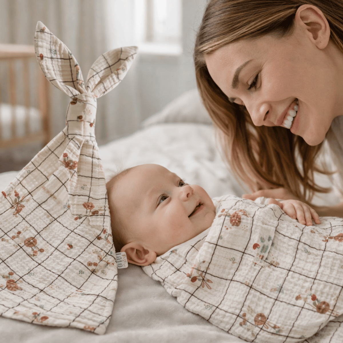 Miękka,przewiewna i bezpieczna przytulanka muślinowa dla niemowlaka idealna od pierwszych dni życia – pomaga dziecku wyciszyć się przed snem i daje poczucie bliskości.